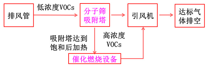 針對(duì)無(wú)組織的低濃度VOCs廢氣,乙戈采用高性能分子篩蜂窩吸附低濃度VOCs,待吸附達(dá)到飽和,再將VOCs脫附,然后催化燃燒,這樣減少持續(xù)催化燃燒消耗的能量,達(dá)到節(jié)能的目的。其“吸附+脫附+催化燃燒”技術(shù)方案如圖1所示。